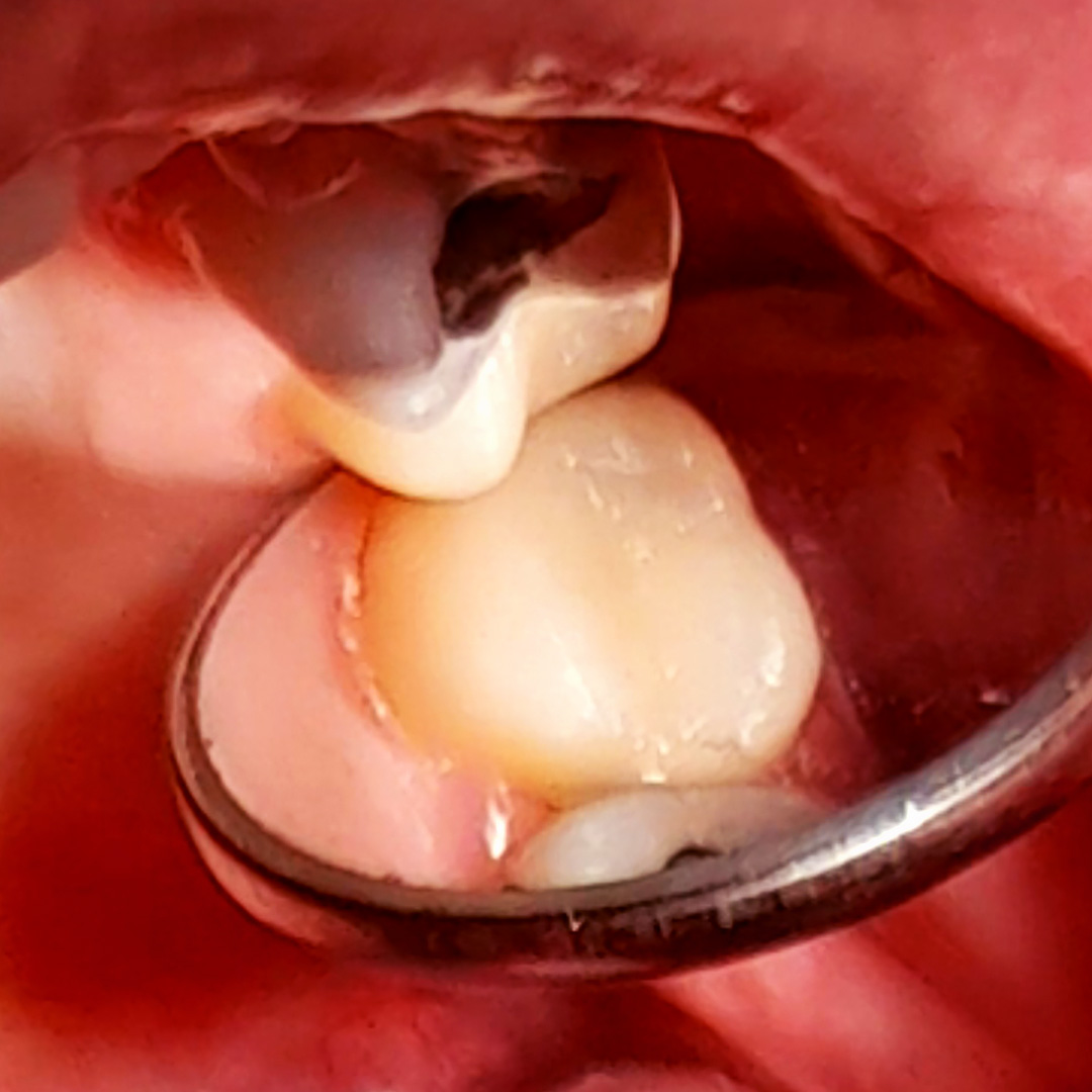 В «Стоматологию Комфорта» обратилась пациентка с жалобами на кратковременные боли от приёма холодных продуктов в области 27 зуба. В ходе осмотра врачом-стоматологом-терапевтом Похилько Н. Г. была обнаружена кариозная полость на жевательной поверхности 27 зуба. Зондирование было болезненно, перкуссия не вызвала реакции. Похилько Н. Г. провела ревизию и обработку полости под контролем кариес-маркера. Был поставлен диагноз: хронический глубокий кариес 27 зуба окклюзионно. Врач принял решение о лечении кариеса с установкой пломбы из материала Estelite.
